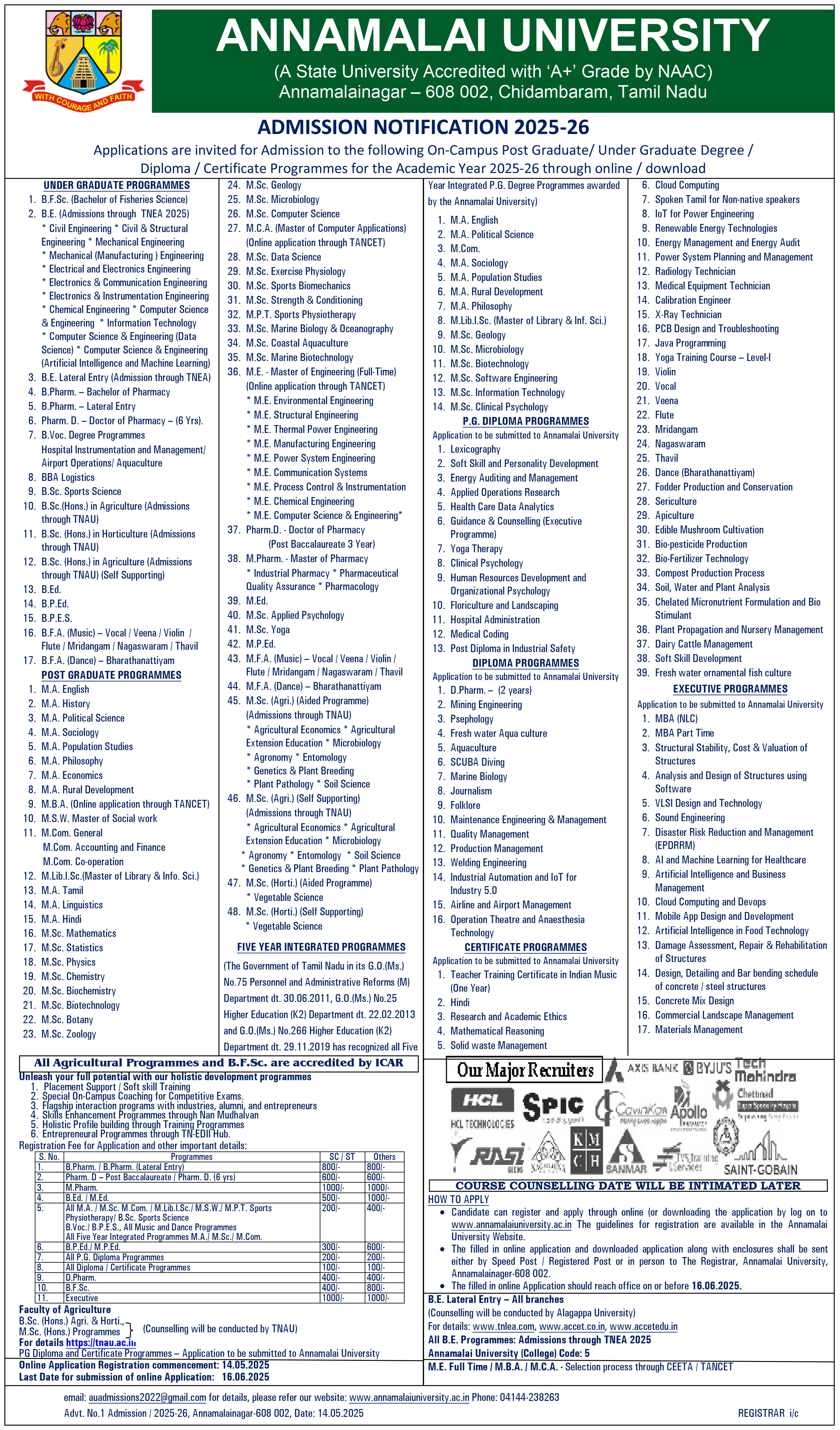 Annamalai Students come from across the country and around the world. They represent a diverse section, comprising of varied backgrounds and cultures. The various courses offered by the University sprawls across different disciplines. Admissions to the various Professional courses are based on the regulations stipulated by the Tamilnadu admissions in Professional Education institutions Act 2006 (TN Act No 3 of 2007). Admission to all courses are purely based on merit following the rules of reservation of the Tamilnadu State Government. The University offers both Under Graduate and  Post Graduate programmes along with a few diploma programmes. The details of each course is given under the Faculty that offers the course. The application to all the Courses are through the online registration and submission of hardcopy to the university.